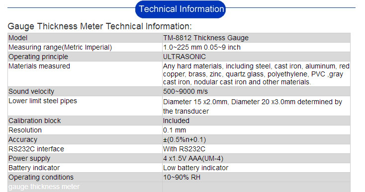 1.Features of TM-8812 thickness gauge 1.Model:TM88122. Measuring range (metric/imperial): 1.2-225mm,0.05-9inch3. Operating principle: ULTRASONIC4. Sound velocity: 500-9000m/s5. Lower limit steel pipes: ф15x2.0mm, ф20x3.0mm determined by the transducer6. Calibration block: included7. Resolution: 0.1mm8. Accuracy: ±(0.5%n+0.1)9. RS232C interface: with RS232C 10. Power supply: 4x1.5V AAA (UM-4)battery11. Battery indicator: low battery indicator12. Operating conditions:0-+45℃(32℉-104℉),≤90%RH13. Dimensions: 120x62x30mm14. Weight: 164g (not including battery)2.Technical Information of TM-8812 thickness gauge