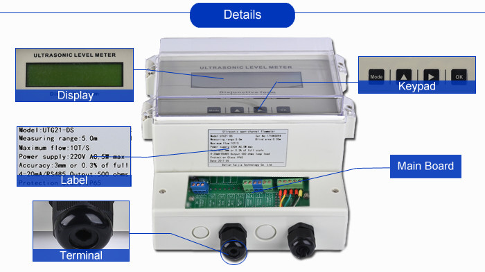 UTG21 series ultrasonic open channel ultrasonic flow meter can directly display the instantaneous and cumulative flow. The built-in EEPROM digital memory makes sure that the data will not lose in case of power failure. With different built-in algorithms, the product supports weirs or notches of different standards in various countries and can be widely used for measurement or monitoring of total water drainage. The measurement result is not affected by the water quality.